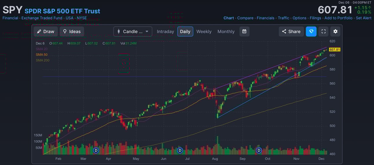 📊 La primera semana de diciembre cerró con un tono positivo para el S&P 500 ✅, que subió un 1% y alcanzó un nuevo máximo histórico de 6,090.27 puntos 📈. Este avance fue liderado por los sectores de consumo discrecional 🛍️ (+4,72%), servicios de comunicación 📡 (+4.1%) y tecnología 💻 (+3.04%).