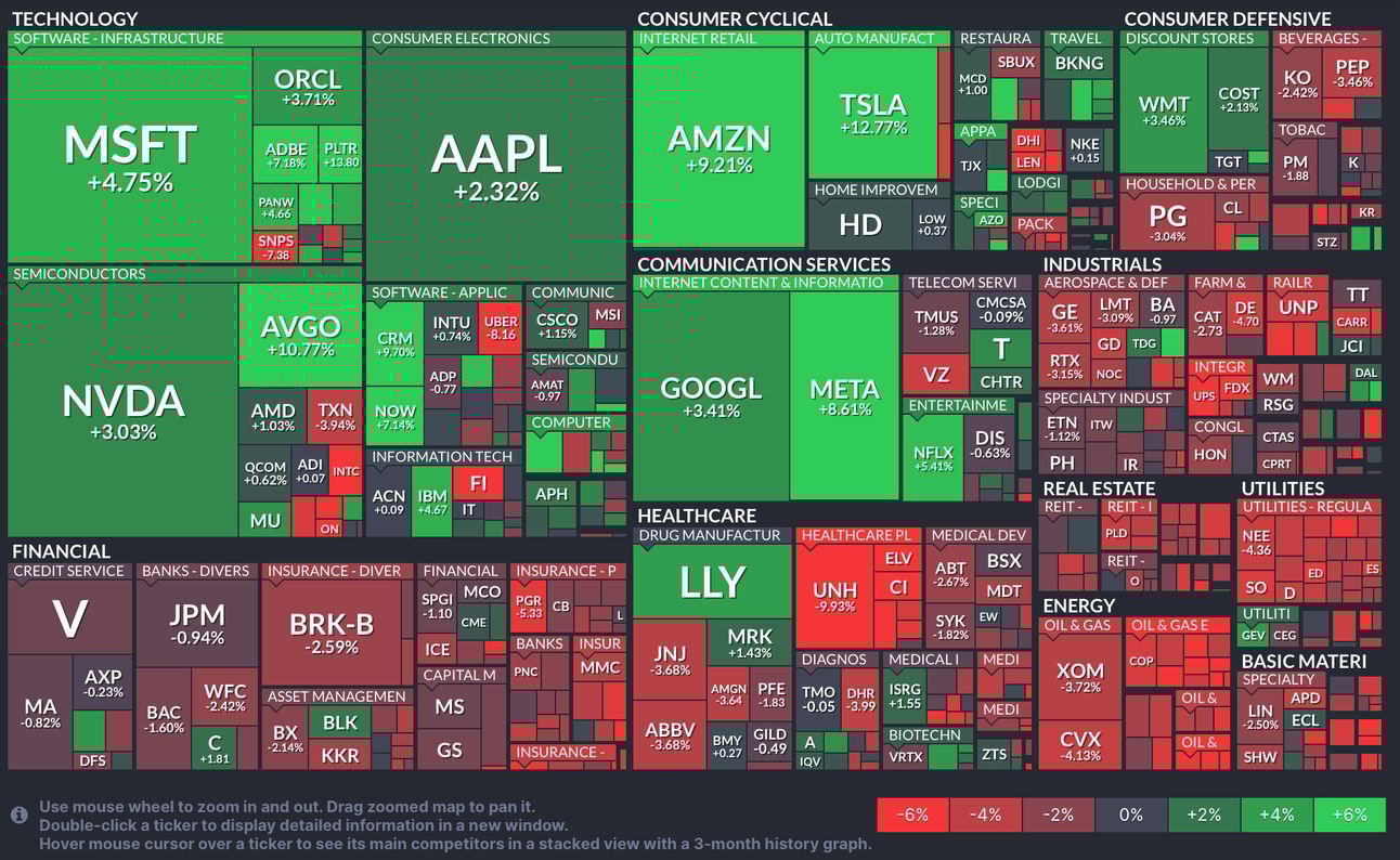 📈 El fuerte desempeño de minoristas 🛍️ como Lululemon (+25%) y Ulta Beauty (+11%), junto con las ganancias de Meta Platforms (+8.6%), impulsaron el índice a nuevos récords. Sin embargo, otros sectores como energía ⛽️ (-4.72%) y servicios públicos 🏥 (-3.8%) cayeron en la semana.