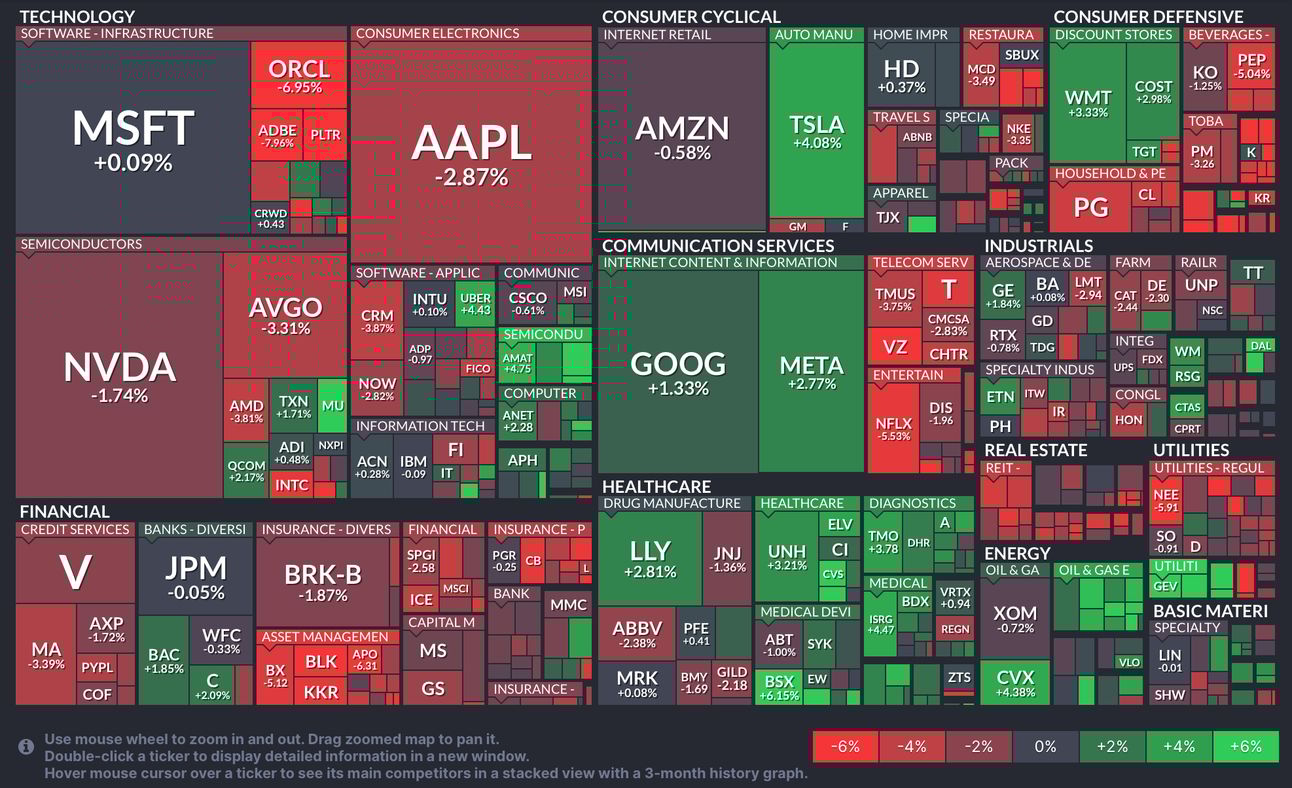 • A pesar de su peso en el mercado, sufrió por la toma de beneficios tras semanas de fuerte rendimiento. Las 7 magníficas han tenido una mala semana que ha lastrado al índice, empresas como Apple (-2.87%), Nvidia (-1.74%), Oracle (-6.95%) y Adobe (-7.96%)