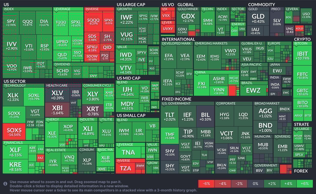 Gran impulso del sector bancario, con el índice regional KRE (+8.16%) liderando las ganancias gracias al optimismo en torno a las tasas de interés y una mayor estabilidad en el sistema bancario.