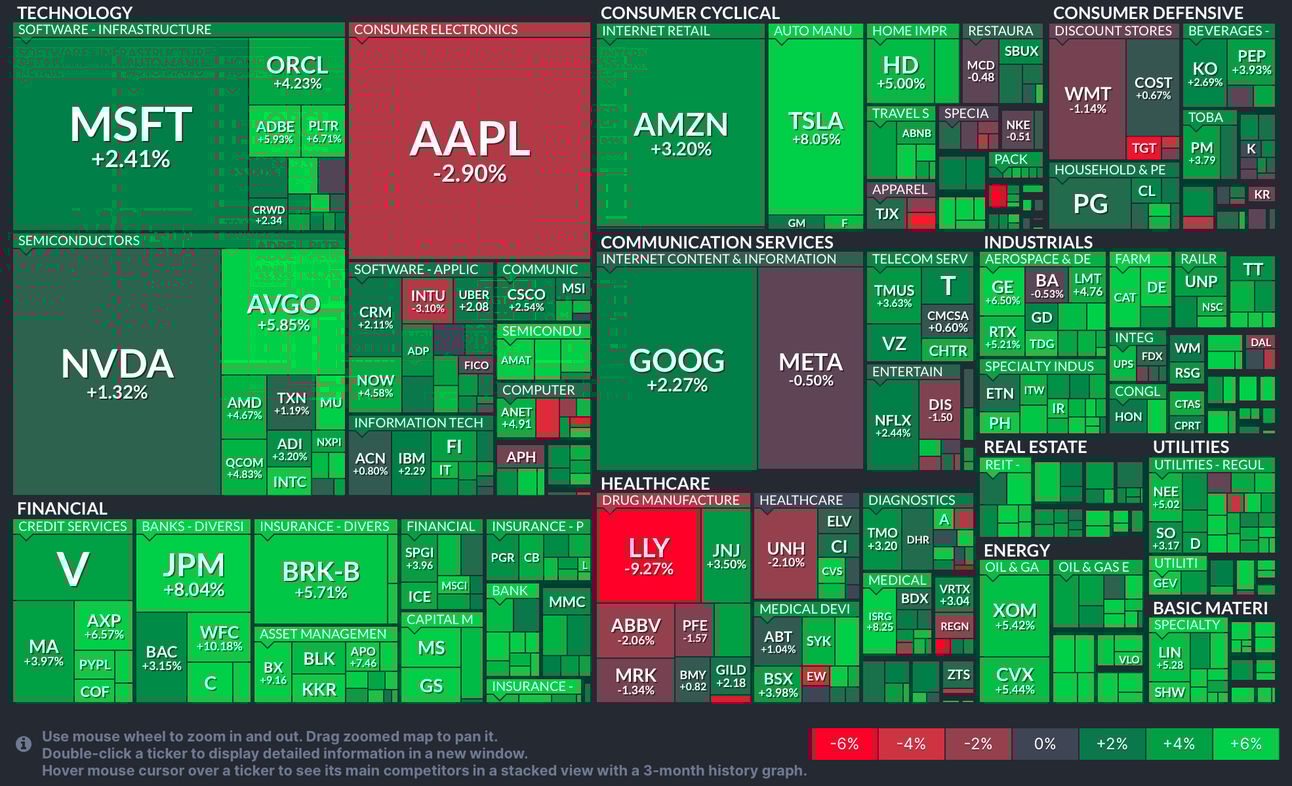 Empresas petroleras en verde, con XOP (+4.41%), reflejando el optimismo en el sector energético ante expectativas de mayor demanda.