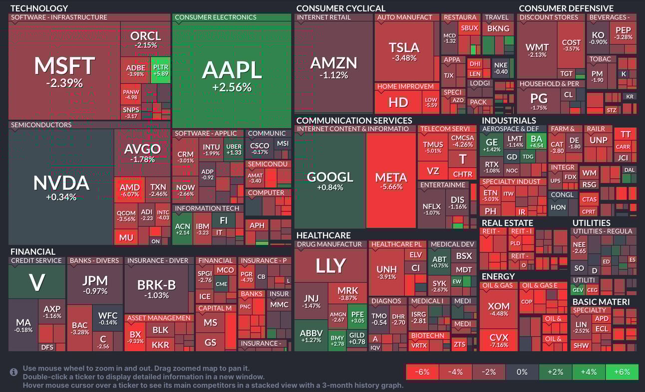 Gigantes como Microsoft (-2.39%) y Oracle (-2,15%) lideraron las pérdidas en el sector, contrarrestando los avances de Apple (+2.56%).