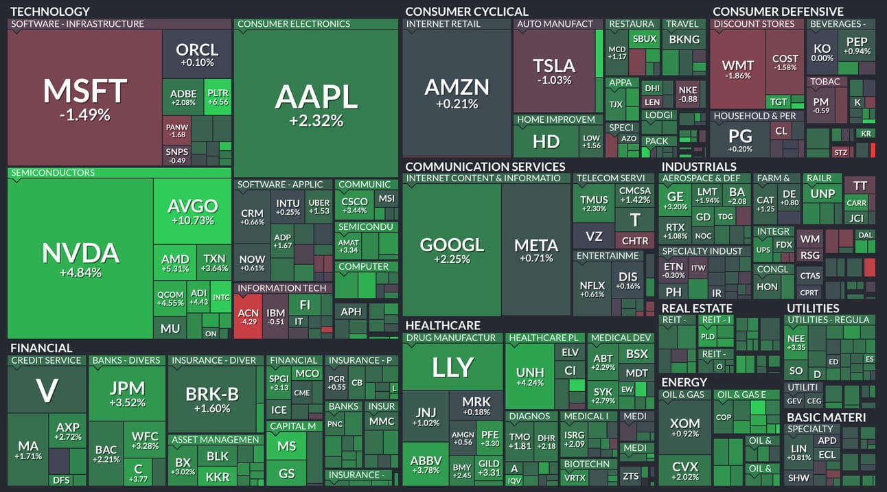 Nvidia (+4.84%) y Apple (+2.32%) lideraron el sector, beneficiándose de sólidas expectativas para 2025 y un fuerte desempeño en semiconductores y dispositivos electrónicos.