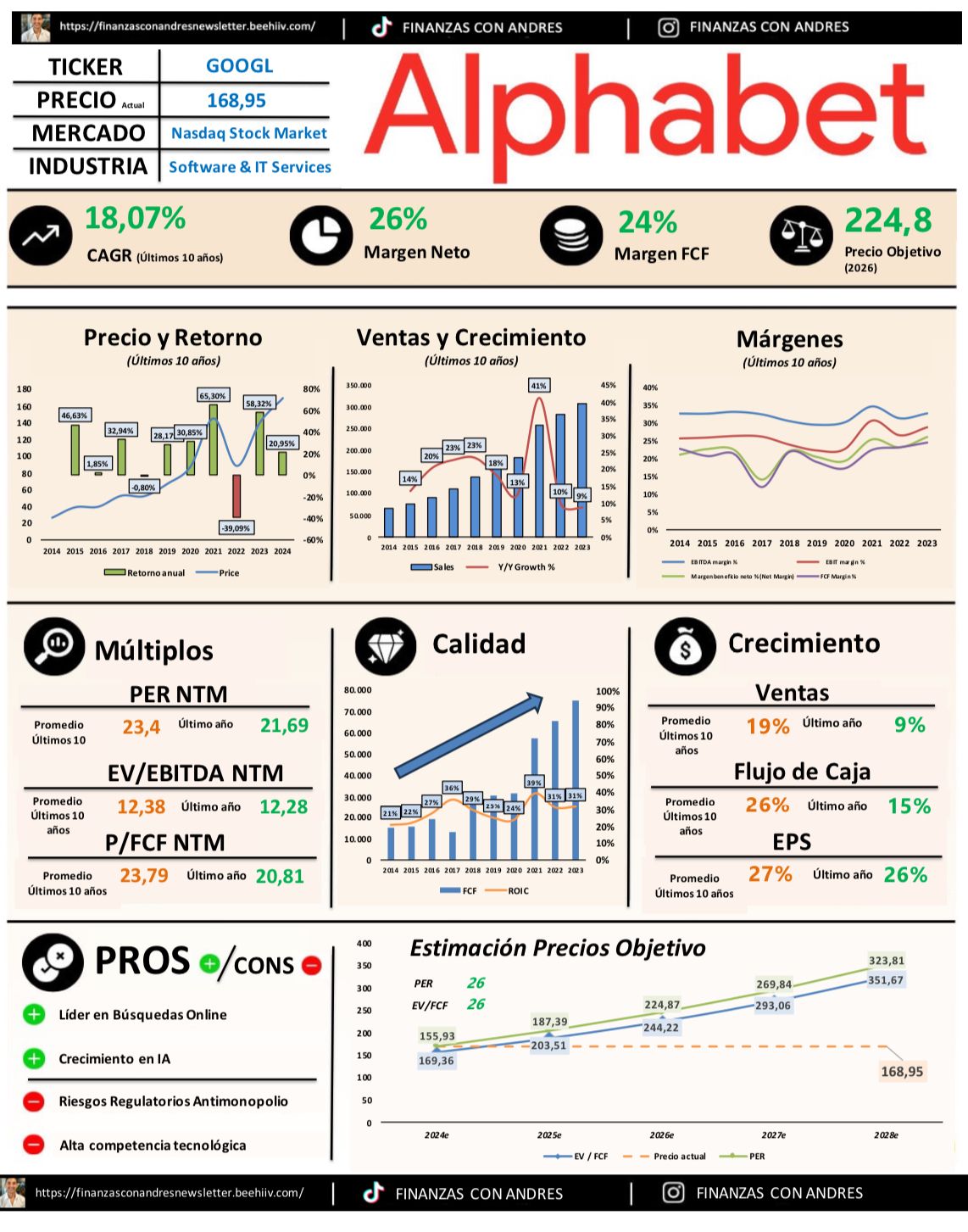 También está liderando la revolución en inteligencia artificial, servicios en la nube y dispositivos tecnológicos. Con un crecimiento sostenido del 18.07% anual en los últimos 10 años (CAGR) y márgenes impresionantes del 26% neto y 24% en flujo de caja, Alphabet se posiciona como una de las compañías más sólidas del mercado.